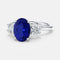 This oval lab-grown blue sapphire diamond three-stone engagement ring showcases a 2.50 CTW design with an 8×6mm center sapphire and round lab-grown diamonds. Set in luminous 14K white gold, it delivers classic beauty with modern sustainability.